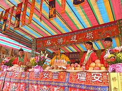 Chinese ritual mastery traditions, also referred to as ritual teachings (Chinese: 法教; pinyin: fǎjiào, sometimes rendered as "Faism"),[1][2] Folk Taoism (民間道教; Mínjiàn Dàojiào), or Red Taoism (mostly in east China and Taiwan), constitute a large group of Chinese orders of ritual officers who operate within the Chinese folk religion but outside the institutions of official Taoism.[3] The "masters of rites", the fashi (法師), are also known in east China as hongtou daoshi (紅頭道士), meaning "redhead" or "redhat" daoshi ("masters of the Tao"), contrasting with the wutou daoshi (烏頭道士), "blackhead" or "blackhat" priests, of Zhengyi Taoism who were historically ordained by the Celestial Master.[3]