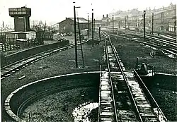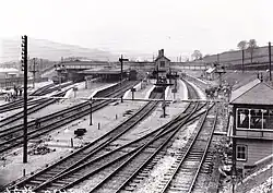 The new station was opened on 1 June 1902, when the line through Disley Tunnel to Heaton Mersey (and thence on to Manchester Central) was opened and the extra tracks between Chinley North Junction & New Mills South Junction were commissioned.[2] It also became the terminus of the Dore and Chinley line, instead of Buxton. The old station buildings were dismantled and re-erected on Maynestone Road as a private house. By 1904, Chinley had become an important junction between Manchester, London St Pancras and Sheffield, with five through platforms and one east-facing bay, with four main tracks passing through it.[3] Many express trains from the Midlands and London would call there to attach or detach coaches for destinations in the North West (including Blackburn and Liverpool Central High Level), as well as the main Midland terminus at Manchester Central. This practice became somewhat less prevalent after the 1923 Grouping when the London, Midland and Scottish Railway took over but, in the 1930s, some 40 eastbound and 38 westbound trains either called or started/terminated at the station each weekday.[2]