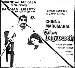 Chinna Marumagal (transl. Younger daughter-in-law) is a 1992 Indian Tamil-language drama film directed by Prasanthkumar (Pseudonym of Telugu Film Director P. Chandrasekhara Reddy) and produced by Keyaar. The film stars Sivaji Ganesan, Siva, Mohini and Delhi Ganesh in lead roles. It is a remake of 1988 Bengali film Chhoto Bou. The film was released on 23 May 1992.[1][2]
