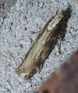 The wingspan is 16–17 mm. The costal half of the forewings is dark brown, and the dorsal half including the apex light ochreous brown. The limit between these two parts of the wing is not very definite and somewhat variable. In the dark costal part lighter, yellowish brown, irregular patches are found, one large indistinct at the middle of the costa and one small rather more distinct costal spot at the beginning of the cilia. In the dorsal light part of the wing are ill-defined darker shadings and the veins are indicated darker so as to produce a striate effect. On the fold at the basal one-third is a small nearly black spot which seems to be constant. There is also a row of black dots around the apical edge. The hindwings are light bluish fuscous.[4]