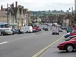 The wide main street of Chipping Sodbury. Cars are parked where market stalls would once have been.
