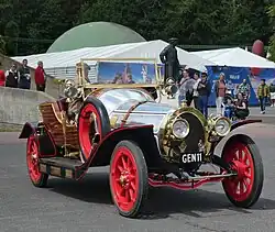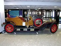 There is an MGM-licensed replica in the United Kingdom, built by Tony Green from the original plans for a commercial photography business over a three-year period, starting in 2000.[40] The car is roadworthy and has the registration number GEN 22.[41] It weighs around 1.5 short tons (1.4 t) and is nearly 18 ft (5.5 m) long and 6 ft (1.8 m) wide. The brass lamps are all original period pieces and the brass snake horn came from one of the original Chitty cars. The engine is a 3L V6 Ford with a BorgWarner automatic gearbox.[42][43]
