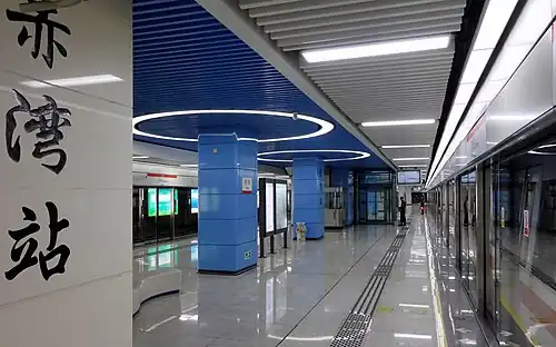 Chiwan station (simplified Chinese: 赤湾站; traditional Chinese: 赤灣站; pinyin: Chìwān Zhàn; Jyutping: Cek3 Waan1 Zaam6) is the southwest terminal metro station on Line 2 and Line 5 of the Shenzhen Metro. It opened on 28 December 2010. The Line 5 platforms opened on 28 September 2019.[1]