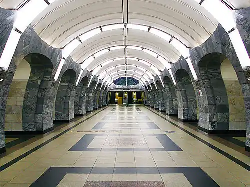 A team of architects designed the station: Nina Alexandrovna Aleshin, Leonid Borzenkov, and Aleksandr Vigdorov. Named after the famous Soviet aviator Valery Chkalov, the decorative theme is dedicated to aviation. The station is modified Pylon trivaulted at a depth of 51 metres. The pylons are revetted with grey and light blue wavy marble whilst the floor is covered with grey red and black granite. The hinged ceiling is covered in semi-circular lighting. The walls are done with combined marble tones.
