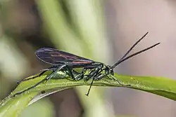 Chlorion aerarium, commonly known as the steel-blue cricket hunter, is a species of thread-waisted wasps in the family Sphecidae.[1][2][3][4] It is similar in shape and colour to the blue mud dauber species, Chalybion californicum, which often overlaps in range.