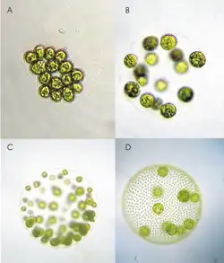 | (A) Gonium pectorale, (B) Eudorina elegans, (C) Pleodorina californica, and (D) Volvox carteri | |