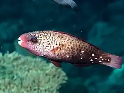 The initial phase has very variable colouration. The smaller fishes can be a uniform dark brown to light gray and they may or may not possess a light band surrounding a dark spot on the caudal peduncle. Larger specimens can show a series of irregular rows of small, light spots towards the tail or they may have the light band surrounding the dark spot on the caudal peduncle. The terminal phase, male, is also variable and may have a large tan area on the flanks or on its caudal peduncle. It has a rounded snout.[2]