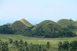 The Chocolate Hills are 1,776 near-identical conical hills or kegelkarsts[3] which straddles across multiple municipalities in the island province of Bohol; Batuan, Bilar, Carmen, Sagbayan, Sierra Bullones and Valencia.[4] It is a major tourist attraction of the province.
