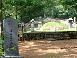 When Yi Sŏng-gye returned to the capital, Ch'oe Yŏng put up a gallant defense at the palace, but was outnumbered and overwhelmed. General Ch'oe was defeated, captured, and banished to Goyang and was later beheaded by Yi Sŏng-gye's government. Before the execution, Ch'oe was famously known to have predicted that due to his unjust demise, grass would never grow on his grave. Grass did not grow on his grave until 1976 and it became known as Jeokbun (적분), which means red grave, because of the red soil.
