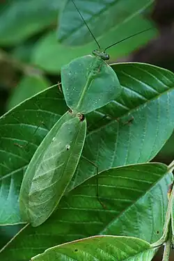 Choeradodis is a genus of praying mantises with common names such as shield mantis, hood mantis (or hooded mantis), and leaf mantis (or leafy mantis) because of their extended, leaf-like thoraces.[1][2][3][4] The distinguishing characteristic of Choreododis from which it takes its common names is a laterally expanded thorax. This adaptation for the purpose of camouflage, as well as a rounded wing case and a habit of staying relatively flattened, aid its leaf mimicry.[5] Tiny liverworts, lichens and fungi have been found growing on the pronotum and wing case of many Choeradodis mantids; these appear to be opportunistic growths rather than an example of coevolution with the mantids to afford extra camouflage.[6]