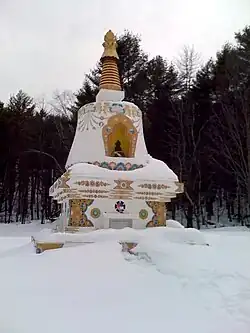 His body was packed in salt, laid in a wooden box, and conveyed to Karmê Chöling.[50] On 26 May 1987, more than 2,000 students and friends[51] and Tibetan Buddhist masters including Dilgo Khyentse Rinpoche, the 12th Tai Situ Rinpoche, the 3rd Jamgon Kongtrul Rinpoche, and the 12th Tsurpu Gyeltsab, Drakpa Tenpa Yarpel Rinpoche, attended Trungpa's cremation ceremony[1] before his kudung was interred in a stupa at Shambhala Mountain Center. Attendants at the ceremony at Karmê Chöling witnessed that the ceremony was accompanied by rainbows, circling eagles,[52][53] and a cloud in the shape of an Ashe as symbolic of enlightenment.[54] "Everyone who stayed long enough at Trungpa's cremation saw the rainbows", Butterfield said.[55]