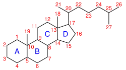 Cholestane is a saturated tetracyclic steroid biosynthetically derived from triterpenoids. This 27-carbon biomarker is produced by diagenesis of cholesterol and is one of the most abundant biomarkers in the rock record.[2] Presence of cholestane, its derivatives and related chemical compounds in environmental samples is commonly interpreted as an indicator of animal life and/or traces of O2, as animals are known for exclusively producing cholesterol, and thus has been used to draw evolutionary relationships between ancient organisms of unknown phylogenetic origin and modern metazoan taxa.[3] Cholesterol is made in low abundance by other organisms (e.g., rhodophytes, land plants), but because these other organisms produce a variety of sterols it cannot be used as a conclusive indicator of any one taxon.[4][5] It is often found in analysis of organic compounds in petroleum.