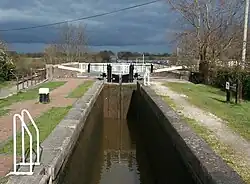 The Chester and Crewe Railway runs east–west through the south of the civil parish. It crosses the Middlewich Branch of the Shropshire Union Canal, which also runs broadly east–west, immediately east of Venetian Marina. Two other canal bridges lie in the civil parish. Just to the west of the marina is Cholmondeston Bridge (SJ634576), which carries Winsford Road. Benyon's Bridge is an accommodation (farm) bridge over the canal at SJ628573.[18] Built in 1827–33 to a design by Thomas Telford, it is listed at grade II.[20] Immediately adjacent to Cholmondeston Bridge is Cholmondeston Lock, the first lock on the Middlewich branch.[18]