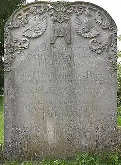 The grave of novelist Dame Agatha Christie is in the churchyard of St Mary's. She lived with her second husband, archaeologist Sir Max Mallowan, at Winterbrook House, formerly in the north of the parish, from about 1934 and died there in 1976.[11] She and her husband had chosen a burial plot in the mid-1960s just under the perimeter wall of the churchyard. About twenty journalists and television reporters attended her funeral service, some having travelled from as far away as South America. Thirty wreaths adorned her grave including one from the cast of her long-running play The Mousetrap, and another sent "on behalf of the multitude of grateful readers" from the Ulverscroft Large Print Book Publishers.[12]