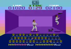 Chop Suey is a one-on-one martial arts fighting game. The action takes place on a box-type stage, watched by an audience sitting in several rows of seats in front of two competitors. Each successful attack on an opponent means their pain bar goes up and when the bar is full, the POW symbol will start blinking. It means the player is in a very fragile state of health - one more punch or kick and the fighter will fall. The match ends when the fighter falls eight times or the timer runs out. At the top of each wall air vents will open occasionally, allowing scorpions to drop to the floor and scuttle away. The players should avoid them at all costs, as they give potentially lethal bites.