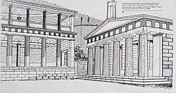 The Choragic Monument of Nikias is a memorial building built on the Acropolis of Athens in 320–319 BCE to commemorate the choregos Nikias, son of Nikodemos.[1] It was situated between the Theatre of Dionysos and the Stoa of Eumenes where its foundations remain along with some fragmentary elements of the structure. It was built in the form of a substantial hexastyle Doric temple with a square cella and might have been surmounted with the prize tripod of the Dionysia.[2] The monument was dismantled at some point in late antiquity and the masonry reused in the Beulé Gate.