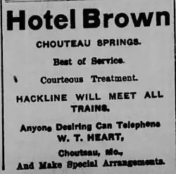 - ^ "Hotel Brown, Chouteau Springs". Sedalia Democrat. Sedalia, Pettis County, Missouri. August 6, 1906. p. 3.