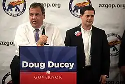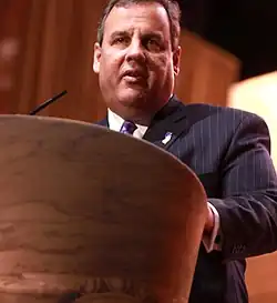 Christie won the 2009 Republican primary for Governor of New Jersey and defeated Democratic incumbent Jon Corzine in the general election. In his first term, he was credited with cutting spending, capping property tax growth and engaging in recovery efforts after Hurricane Sandy. He was re-elected by a wide margin in 2013, defeating State Senate Majority Leader Barbara Buono.[1] Christie's second term saw multiple controversies, namely the Fort Lee lane closure and his various absences from the state.[2][3] He chaired the Republican Governors Association during the 2014 campaign. His term as governor expired in 2018 and he registered as a lobbyist in 2020.[4]