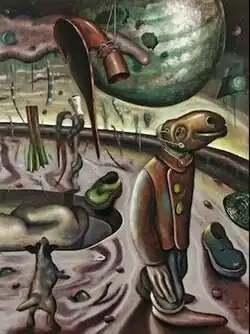 In 1989, Gollon was a finalist in The Spectator Prize.[8] His first solo museum exhibition was at the Ferens Art Gallery in Hull in 1993, which was then Museum Gallery of the Year.[9] The exhibition was televised on BBC Look North.[8] Chris Gollon was a friend of The Skids and enjoyed the company of musicians.[10][7] In 1998, he exhibited with David Bowie, Yoko Ono, and Gavin Turk in 'ROOT', created by Thurston Moore of Sonic Youth, a crossover exhibition of contemporary music and art at Chisenhale Gallery, London.[11] For 'ROOT', Thurston Moore sent Gollon a 52-second tape and challenged him to make either a work of music or art in response. Gollon produced a painting entitled 'House of Sleep' for the 'ROOT' exhibition, which began his nineteen-year fascination with artistic boundary crossing, and how one art form can take another into new areas of thought and feeling and vice versa.[7] 'House of Sleep' sold into a private collection in 1998, but it was loaned for the museum retrospective in 2019 at Huddersfield Art Gallery, in the catalogue for which Thurston Moore wrote "Chris Gollon's work moves beyond painting as singular expression, where music and its essence of spiritual sentience, comes into accord, creating a personal yet welcoming environment, alive and free. I am proud to have had a moment where we colluded via the gestures of mutual acquaintance. His creative and modest genius is eternal."[7]