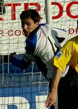 He started 2002–03 well, taking his place in the team due to injuries to other players.[25] He made his first appearance in the opening match, a 1–1 draw away to Macclesfield Town on 10 August 2002, with chairman John Batchelor claiming Smith had a "wonderful game and if we can get that sort of attitude from everyone in the team we won't have any problems".[27] Smith was dropped to the bench for a 1–1 home draw with Wrexham on 29 October 2002 due to a change in formation, having started every match in 2002–03 prior to this match, although he did play as a 48th-minute substitute.[28] He suffered a hamstring injury in early-November 2002,[29] making his return in a 1–0 victory away to Rochdale on 23 November.[30] Smith received his first red card of 2002–03 for a second bookable offence in a 1–1 home draw with Hull City on 28 December 2002, resulting in a one-match suspension.[31] This meant he missed York's match against Torquay on 11 January 2003, and after a short spell on the sidelines returned in a 2–1 home win over Macclesfield on 2 February.[30][31][32] Smith finished 2002–03 with 39 appearances for York,[30] and was described by the Evening Press as the "surprise star of the season".[33] Despite being in outstanding form and becoming a fans' favourite,[34] he was not offered a new contract with York at the end of 2002–03 by Dolan, although he hoped to still to have a future at the club.[35] This decision was reversed by newly appointed player-manager Chris Brass, and Smith signed a new one-year contract in July 2003.[36]