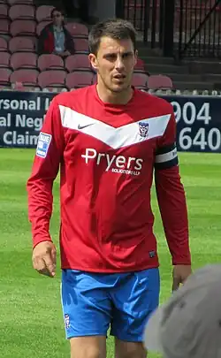 After making a mistake that led to York conceding a goal late on in a 1–1 draw away to Forest Green on 26 November 2011,[152] he was replaced in the line-up by McGurk for the next match at home to Lincoln three days later.[153] This was the start of a second extended spell out of the team for Smith that season, before returning to play as a defensive midfielder in a 3–5–2 formation for York's FA Trophy first-round replay away to Solihull Moors on 13 December 2011.[143][154] He scored his first goal of the season in the 11th minute of this match, converting Scott Kerr's cross at the far post, with York going on to win 3–0.[143] However, he returned to the bench for the subsequent league match against Kidderminster on 19 December 2011, with York reverting to their usual 4–3–3 formation.[154] With York reverting to 3–5–2 for a 1–1 draw away to Mansfield on 26 December 2011, Smith returned as a defensive midfielder,[155] but after picking up his fifth yellow card of the season was suspended for the reverse fixture at home to Mansfield on 1 January 2012.[156] Smith captained York to victory in the 2012 FA Trophy Final at Wembley Stadium on 12 May 2012, with Newport County being beaten 2–0.[157] This was the first time York had won a national knockout competition.[157] Eight days later, he captained York to a 2–1 victory over Luton in the 2012 Conference Premier play-off final at Wembley Stadium, meaning the club regained Football League status after eight years with promotion to League Two.[158]
