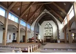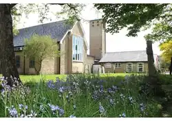 The authors of the Buildings of England series comment that the church and parish rooms have "a mishmash of an exterior".[3] The church is constructed in yellow sandstone with red sandstone dressings. The architectural style is Free Perpendicular. Standing to the southwest of the church are single-storey parish rooms, from which rises a tower with an open bell stage and a saddleback roof. Inside the church is stained glass installed in 1975 and designed by the artist Brian Clarke.[3]