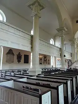 When the congregation outgrew the original building twenty years after its construction, they decided to erect a new church, the most sumptuous in the Thirteen Colonies. The main body of the church was constructed between 1727 and 1744, and the steeple was added in 1754, making it the tallest building in the future United States, at 196 feet (60 m).[5] Christ Church is considered one of the nation's most beautiful surviving 18th-century structures, a monument to colonial craftsmanship and a handsome example of Georgian architecture. Modeled on the work in London of Christopher Wren,[2] it features a symmetrical, classical façade with arched windows and a simple yet elegant interior with fluted columns and wooden pews. Although the architect of the church is unknown, its construction was supervised by John Kearsley, a physician, who was likely also responsible for the design, possibly with John Harrison.[2][6] The church was rebuilt in 1777 by Robert Smith, and the interior was altered in 1883 by Thomas Ustick Walter.[6]