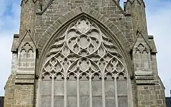 The clerestory windows are copies of those at Exeter Cathedral. On either side of the west window, sit two smaller windows. They were installed in 1879 and are the only two windows in the cathedral made with gold dust. The final window installed in the cathedral was installed in 1908 and sits in the choir vestry. It has a similar design to a 14th-century church stained glass window.[8]: 47