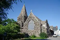 The church was founded in 1848, but a local hall was used for services until a wooden church was built in 1849. The wooden structure eventually proved inadequate and a larger church designed by Peabody and Stearns was built of local fieldstone at the current location between 1897 and 1898.