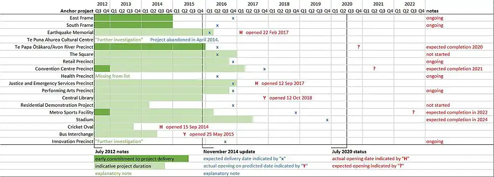 The timeline graphic is based on the indicative project delivery schedule contained in the Blueprint published in July 2012,[66] a pamphlet published in November 2014[67] plus the status as of July 2020. None of the projects were delivered as per the originally published indicative project delivery schedule.[68] The first project to be completed was Hagley Oval (September 2014). The original schedule saw all projects where a delivery date had been specified completed by March 2017; at that point in time just three of the seventeen projects had been completed (the Bus Interchange was the second project (May 2015) to be finished, and the Earthquake Memorial the third project in February 2017).[68] Ngāi Tahu abandoned its anchor project—Te Puna Ahurea Cultural Centre—in April 2014.[9] As of July 2020, neither the Square, the Residential Demonstration Project, nor the stadium had been started, and only the stadium had a confirmed project status.