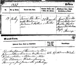 - ^ Christian Mortensen's birth record (see image) shows his birthplace as the village of Skaarup, Denmark, which was located in Fruering Sogn (parish), Hjelmslev Herred (Hundred), Skanderborg county, which is now part of Skanderborg municipality.
