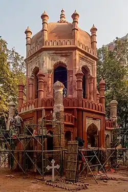 The largest structure in the cemetery is a mausoleum containing three graves, all without any inscription.[3] A painting of the mausoleum was completed by the German artist Johann Zoffany in 1786, titled "Nagaphon Ghat"[4] (translated from Bengali it means the Nagaphon mooring or dock), depicting the structure on the Dolai Khal or creek, that has since been filled up and no longer reaches as far as the cemetery.[5]