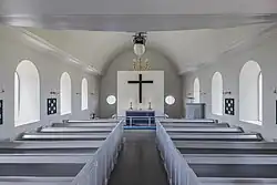 The church was first consecrated in 1685 when the island's fortifications were completed. Serving the garrison, it was in a small ground-floor room in the fortification tower, where it was used until 1821. It was then moved some two hundred metres (660 ft) to the east to its present location on an irregular quadrangular plot surrounded by fieldstone walls. The small rectangular granite building was rebuilt and enlarged in 1852, with a porch added on the western side. Comprehensive restoration work was undertaken in 1928 under architect Christian Olrik. The main entrance was widened, and a gallery was added inside. The four straight-sided windows on either side of the nave were slightly reduced in size and given a rounded finish. The ceiling consists of a plastered, wooden barrel vault.[1]