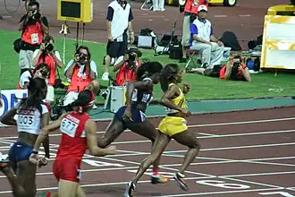 In preparation for the European Indoor Championships in Turin, Ohuruogu set personal bests in the 60 metres and 200 m at the Birmingham Grand Prix.[33] She competed at the 2009 Manchester City Games, finishing second in the 150 metres final in 17.10 seconds.[34] She ran a personal best 22.85 seconds to take second place in the 200 m at the Fanny Blankers-Koen Games.[35] While she won the 400 m national title at the UKA Championships in Birmingham that July, her times and finishes over the distance at IAAF Golden League meets were unimpressive.[36] She had failed to break 51 seconds in the 2009 season; some distance behind world-leader Richards's best of 49.23 seconds.[37] A hamstring problem caused her to withdraw from the London Grand Prix, raising doubts that she would be able to defend her World title.[36] Ohuruogu's form improved in time for the 2009 World Championships, and she set a season's best time in her semi-final heat. She ran another season's best of 50.21s in the final, well behind Sanya Richards, who won in a time of 49.00s.
