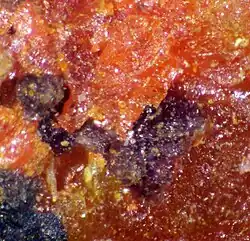 Christite is a mineral with the chemical formula TlHgAsS3. It is named after Dr. Charles L. Christ, a member of the U.S. Geological Survey. It usually comes in a crimson red or bright orange color. It has a density of 6.2 and has a rating between 1 and 2 on Mohs Hardness Scale. Christite has an adamantine luster and leaves behind an orange streak.[3] Its crystal system is monoclinic with possible crystal classes of twofold symmetry, mirror plane symmetry, and twofold with a mirror plane. This means it can have radial symmetry, mirror plane symmetry, or mirror plane symmetry perpendicular to the two-fold axis.[5] It is an anisotropic mineral, which means that it exhibits different properties when measured in different directions. In plane polarized light, its color is golden yellow. It is birefringent, which means that it has two distinct indices of refraction. This can be seen when one looks through the microscope with both polars crossed and sees the mineral change colors when it is rotated.