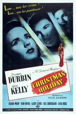 Christmas Holiday is a 1944 American film noir crime film directed by Robert Siodmak and starring Deanna Durbin and Gene Kelly.[2] Based on the 1939 novel of the same name by W. Somerset Maugham, the film is about a woman who marries a Southern aristocrat who inherited his family's streak of violence and instability and soon drags the woman into a life of misery. After he is arrested, the woman runs away from her husband's family, changes her name, and finds work as a singer in a New Orleans dive.[3] The film received an Academy Award nomination for Best Musical Score for Hans J. Salter.