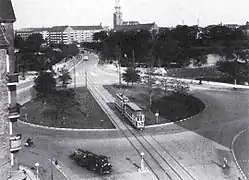 A roundabout, supposedly the largest in the country, was built at the site in 1942. The roundabout was bisected by tramway tracks. The roundabout was removed and replaced by new traffic lanes and street lights when the last trams disappeared in 1971. The junction was named Christmas Møllers Plads was introduced in 1950 to commemorate the Conservative politician Christmas Møller who had been active in the resistance movement during World War II and later served as Minister of Foreign Affairs.[1]
