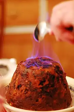 The traditional Christmas dinner consisted of boiled,[9] spiced, roast beef, a roast goose and ham with a selection of vegetables and roast potatoes.[6] Beef remained the most popular Christmas meat in Ulster until into the 20th century, with boiled ox-head popular in Counties Armagh, Monaghan, and Tyrone.[9] The cooking of a turkey is a more modern, imported tradition.[7] They also have round cake full of caraway seeds. Dessert often consisted of an array of dishes, with Christmas pudding a traditional choice, which is sometimes served with brandy being poured over it and then set alight.[15] Along with the Christmas tree, it is thought that the plum pudding and mince pies came to Ireland from England.[5] It was considered unlucky to cut the pudding before Christmas Day, and if the pudding broke during cooking the baker would be dead before next Christmas.[13] In County Wexford a traditional dish known as "cuttlin pudding" was made on Christmas Eve. In County Donegal, pies in the shape of cradles to represent the manger were traditional.[9] Other desserts include Christmas cake,[15] sherry trifle, yule log and mince pies with sauces such as brandy butter.