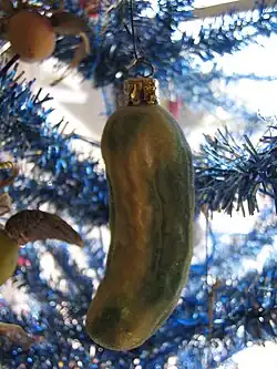 In the tradition, an ornamental pickle is placed on a Christmas tree as one of the Christmas decorations. On Christmas morning, the first person to find the pickle on the tree would receive an extra present from Santa Claus or would be said to have a year of good fortune.[1]