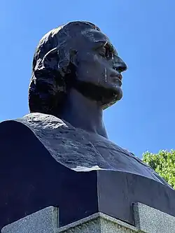 Below the bust is a granite pedestal with a plaque and relief carvings underneath.[2] The carving on the front of the pedestal depicts a figure grouping with a man draped in fabric and wearing a crown of laurels standing in the center. His left arm is raised in the air and right hand rests in front of his waist. To the left and right of this man, three figures are featured, two of whom are kneeling before him. The relief on the pedestal's proper right side depicts a seated woman with her right hand resting on her chest and left hand on a large anchor; her head is turned to her right. The relief on the pedestal's proper left side is a profile view of a seated woman resting her right elbow on a globe. Below the relief sculptures, the pedestal slopes outward to meet a two-stepped granite base.[2]