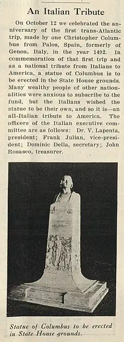 - ^ a b Unknown author (17 June 1919). “Indianapolis Italians to Offer City Monument to Christopher Columbus”. Indianapolis News (Indianapolis).