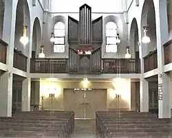 The first organ was built with the church, by Gebr. Link from Giengen. The instrument took part in the Universal Exhibition in Antwerp in 1894, and was awarded a Medal of Honor. It was dismantled in World War I, and transferred to the Church of Ascension, Rue Dulong, in Paris in 1919. The project of a new organ was supported by Albert Schweitzer, but was interrupted by World War II.[4] The present organ was built in 1964 by Detlef Kleuker from Bielefeld.[4][5] It is modeled after German Baroque organs. Konrad Adenauer, the German Chancellor, supported its financing.[4] Titular organists were Gunther Morche (1964), Detlef Wieghorst (1965–1966), Peter Neumann (1966–1967), Detlef Schmidt (1967–1968), Wolfgang Karius (1968–1970), Jean-Marc Pulvert (1971), Edgar Krapp (1971–1972), Annetta Schmid (1972–1974), Elisabeth Roloff (1974–1982), and since Helga Schauerte.[5]