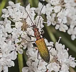 Adults are phytophagous. They can mostly be encountered from May through July[3] feeding on pollen and nectar mainly of Apiaceae species, especially Angelica sylvestris and Heracleum sphondylium, but also on Cistus salviifolius (Cistaceae) and Achillea millefolium (Asteraceae).[1][3] The larvae live inside roots or in dead wood, being xylophages.