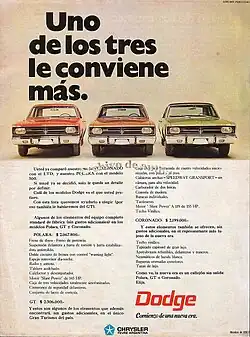 Launched in 1971,[10] the Dodge 1500 (based on the Hillman Avenger produced by British firm Rootes Group, also a subsidiary of Chrysler)[11] became the first mid-size car to be produced by an American firm in Argentina. That was also the first non-US automobile marketed by Chrysler in Argentina.[11] The success of the 1500 helped the company to increase its sells in the country.[12][13] The car had also a station wagon version launched in 1978.[10]