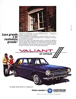 In December 1961 the first automobile by Chrysler Argentina S.A., Valiant V200, began to be produced although it was not on sale until 1962.[7] This compact car model was intended to compete with the Ford Falcon and Chevrolet 400. Transmissions and engines were imported during that first year of production. In 1963, the Slant Six engine and the 3-speed gear sticks were added to local production. That same year, the "Valiant II" (with the same body style but equipped with a 3687cc (3.7 liter) 137 HP Slant Six engine)[7] was launched.[7]