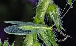 Chrysoperla carnea, one of the species of common green lacewing,[1][2] is an insect in the Chrysopidae family. Although the adults feed on nectar, pollen and aphid honeydew, the larvae are active predators and feed on aphids and other small insects. It has been used in the biological control of insect pests on crops.