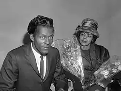 At the end of June 1956, his song "Roll Over Beethoven" reached number 29 on the Billboard's Top 100 chart, and Berry toured as one of the "Top Acts of '56". He and Carl Perkins became friends. Perkins said that "I knew when I first heard Chuck that he'd been affected by country music. I respected his writing; his records were very, very great."[35] In late 1957, Berry took part in Alan Freed's "Biggest Show of Stars for 1957", touring the United States with the Everly Brothers, Buddy Holly, and others.[36] He was a guest on ABC's Guy Mitchell Show, singing his hit song "Rock 'n' Roll Music". The hits continued from 1957 to 1959, with Berry scoring over a dozen chart singles during this period, including the US Top 10 hits "School Days", "Rock and Roll Music", "Sweet Little Sixteen", and "Johnny B. Goode". He appeared in two early rock-and-roll movies: Rock Rock Rock (1956), in which he sang "You Can't Catch Me", and Go, Johnny, Go! (1959), in which he had a speaking role as himself and performed "Johnny B. Goode", "Memphis, Tennessee", and "Little Queenie". His performance of "Sweet Little Sixteen" at the Newport Jazz Festival in 1958 was captured in the motion picture Jazz on a Summer's Day.[37]