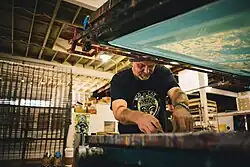 Hangar 18 is also where Sperry prints his fine-art pieces on various types of paper and wood panel, usually oak, for exhibitions at Spoke Art and Hashimoto Contemporary in San Francisco and New York, Art Basel Miami/Context Art Miami, L’Oeil Ouvert Galerie in Paris, and Next Door Gallery in Geneva.