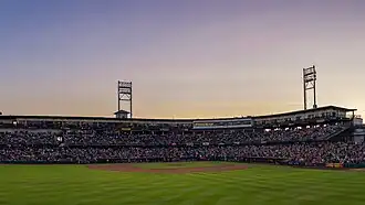 The stadium was designed by Populous, the firm responsible for many of today's sports stadiums like Oriole Park at Camden Yards, Petco Park, Comerica Park and Oracle Park in San Francisco. The $46 million facility seats 10,650, with left field dimensions of 324 ft (99 m); center field, 400 ft (120 m); and right field, 335 ft (102 m). The ballpark features 600 club seats and 32 luxury suites[8]