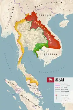 Clockwise from upper left: Government House, Santa Cruz Church, Ananta Samakhom Throne Hall, and the Democracy MonumentUnder Chulalongkorn's father and predecessor, Mongkut, Siam began to modernise in the face of British and French colonial ambitions in the region. British colonial ambitions laid in Burma and Malaya, whilst French ambitions were in Indochina. For both, Siam had to cede land that was under its influence.[4] In 1893, Siam experienced a short crisis with France, deteriorating relations between the two. Additionally, the crisis resulted in the French occupation of the ethnically Siamese province of Chanthaburi.[5] In 1896, Britain and France signed a joint declaration where Siamese independence and sovereignty over the Chao Phraya river basin was guaranteed. The declaration, however, did not guarantee continued Siamese control over its more frontier provinces.[6]